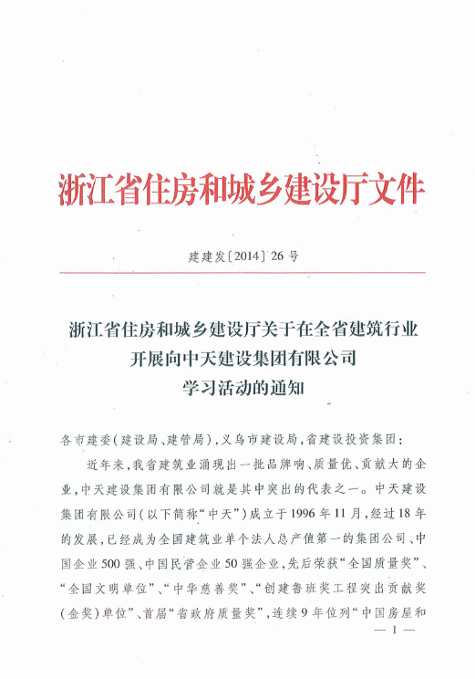 《浙江省住房和城乡建设厅关于在全省建筑行业开展向尊龙时凯建设集团有限公司学习活动的通知》